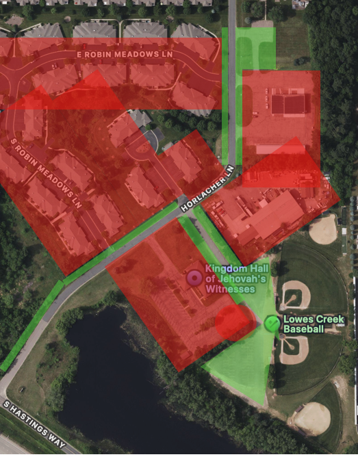 There are also a couple areas on the road and in the complex that we should not park at, so please pay attention to the red areas on the map. Calling out a couple areas in particular: the area around and across from the entrance to Briggs, as well as the corner across from concessions in the LCB Complex lot should not be used for parking.