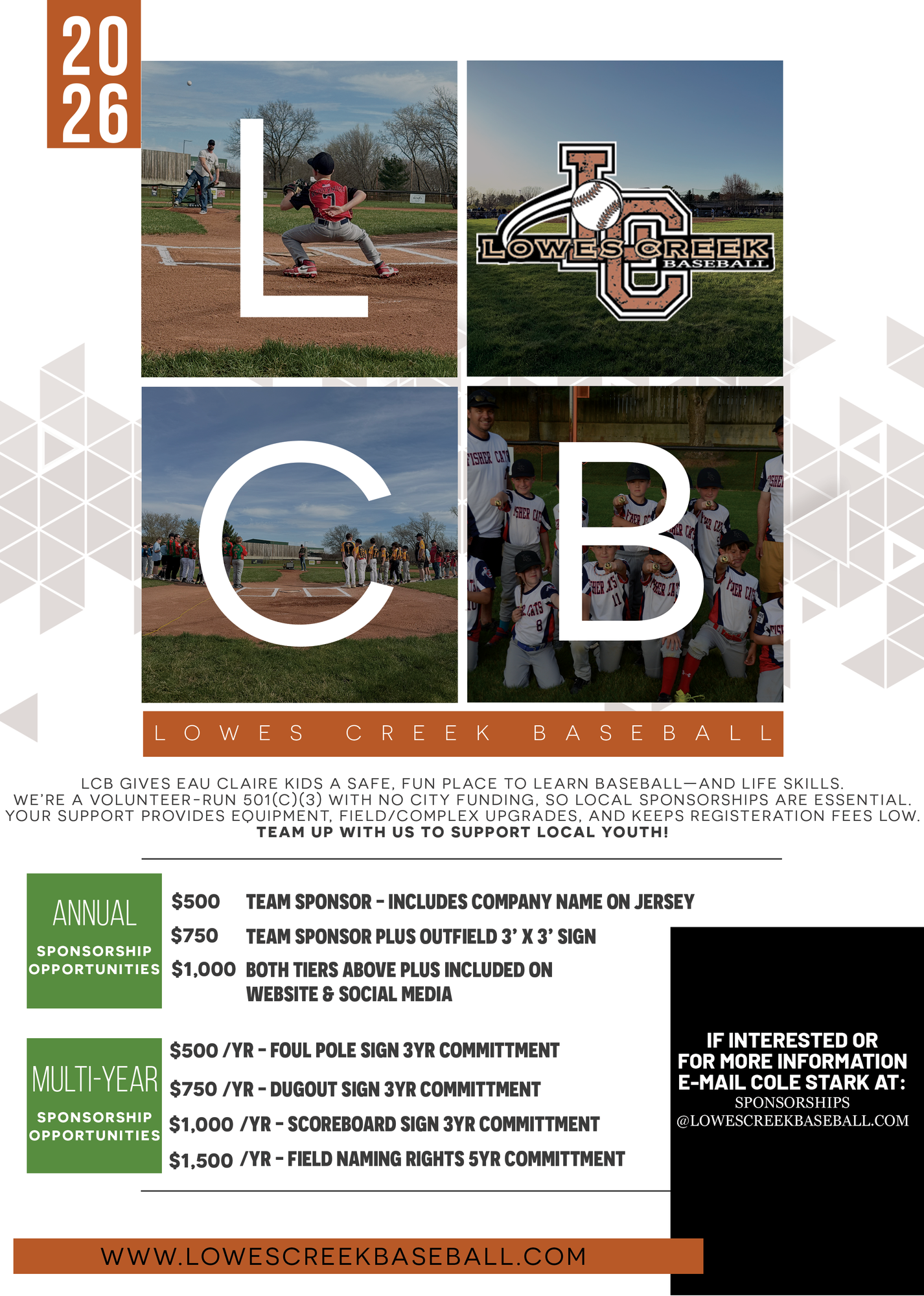 As a nonprofit 501(c)(3), all-volunteer organization, we need the support of local businesses to give our kids the best possible baseball experience. *Note: Lowes Creek Baseball receives zero monetary funding or facility maintenance from the City of Eau Claire.