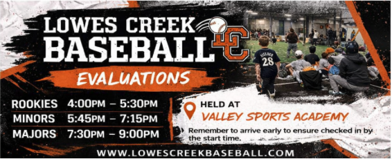 Any questions please feel free to reach out to any board member or email info@lowescreekbaseball.com