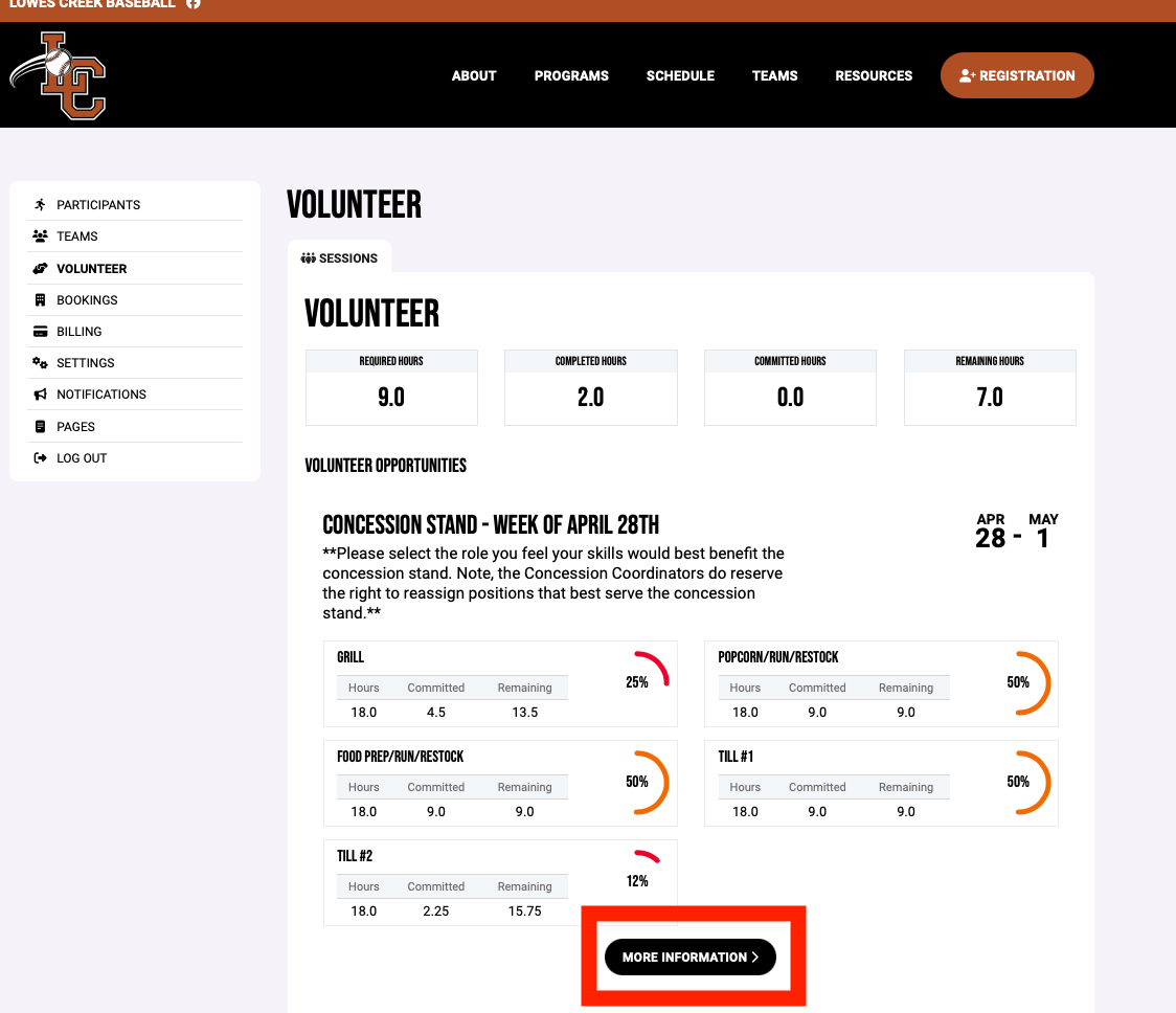 Please use the link below to access the volunteer page for signing up for your shifts! You will need to be logged into your account to access the page. Additionally, you can click on Account at the top left of this page, and then select Concessions - Volunteer from the sidebar. With our new system, your information should automatically populate, and your commitment hours be reflected!